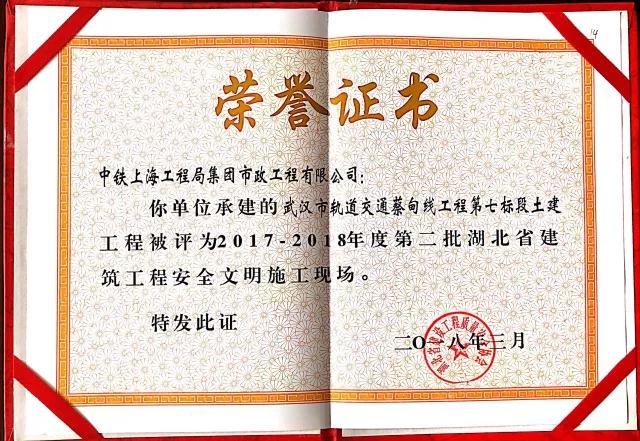 武漢市軌道交通蔡甸線第七標項目部榮獲“湖北省建筑工程安全文明施工現場”榮譽稱號